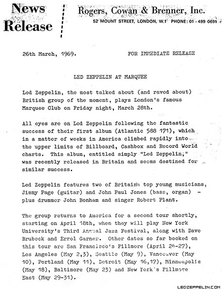 Led Zeppelin, the most talked about (and raved about) British group of the moment, plays London's famous Marquee Club on Friday night, March 28th.