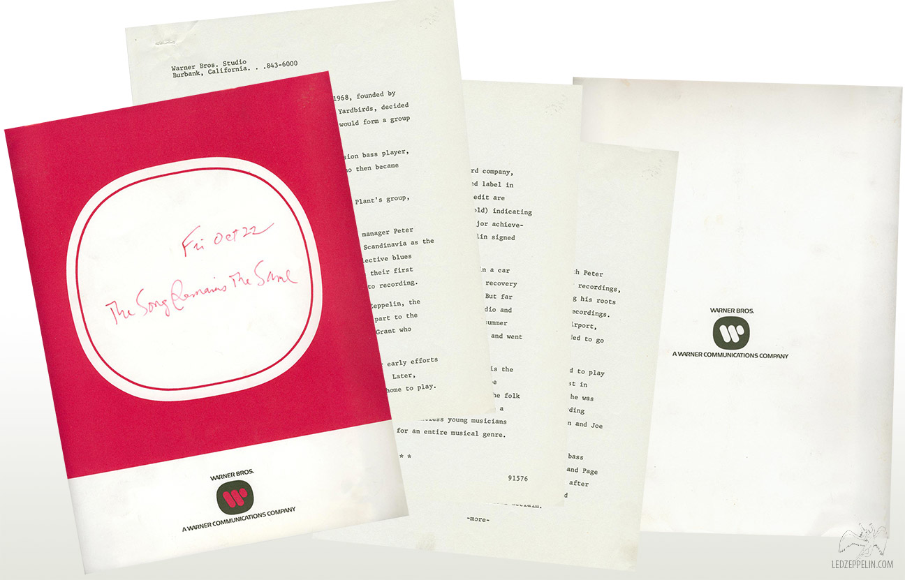 Song Remains the Same - 1976 Warner Bros Press Kit -
