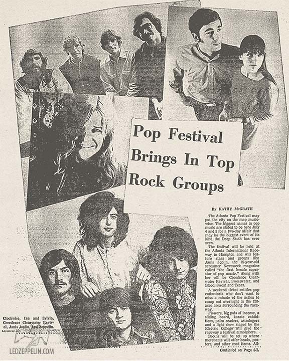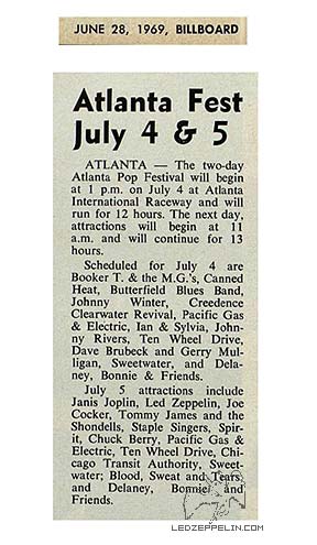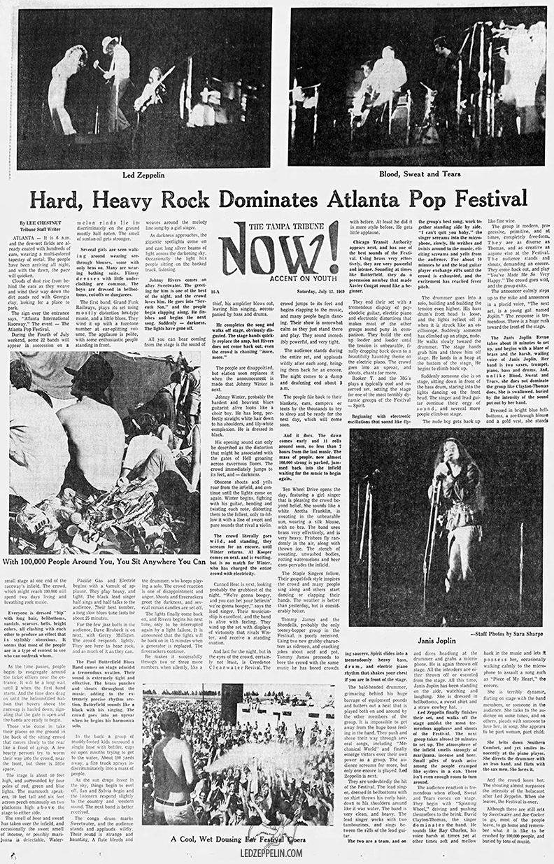Press Review excerpt (1) - Atlanta: Led Zeppelin, relative new comers to the rock heap, saved the late night crowd from impending lethargy and put the mob into a riotous mood. Cool enough to move around a little more now, the mass of humanity began dancing and swinging thourgh the infield, as Led Zeppelin, with the accent on blues, ran through a sebers and a few borrowed ones, dedicating them to Johnny Winter. [Inquirer / 7/69 / -J. Knippenberg]