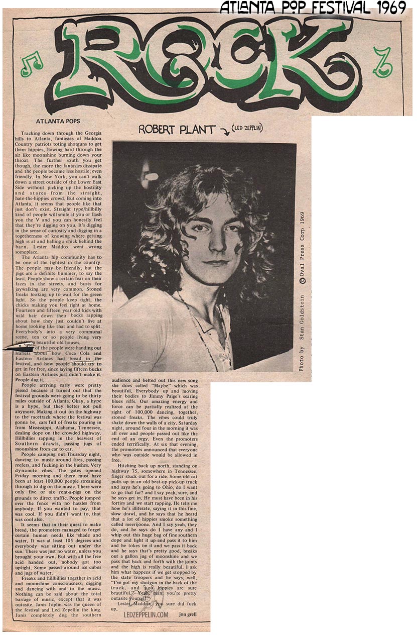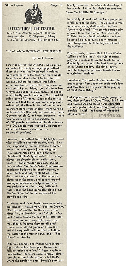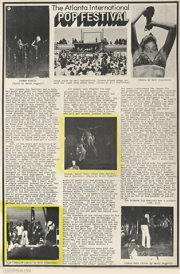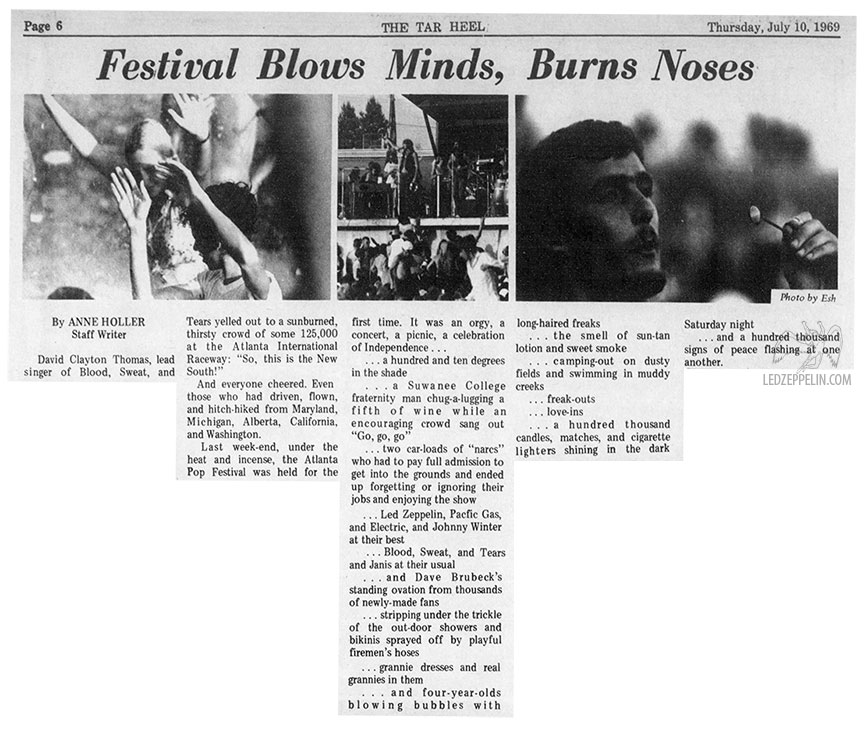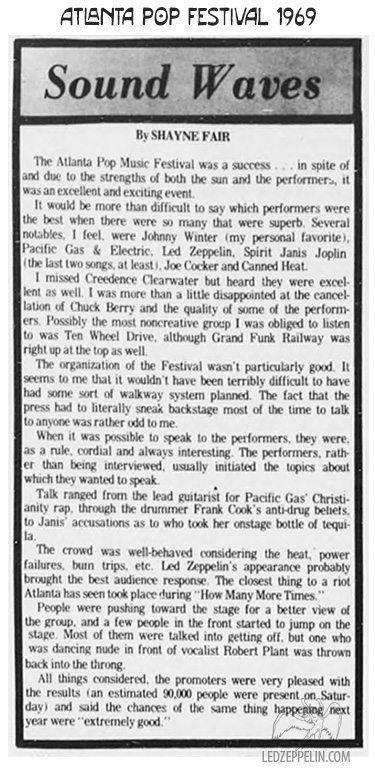 Press Review (4): (excerpt) The crowd was well-behaved considering the heat, power failures, burn trips, etc. Led Zeppelin’s appearance probably brought the best audience response. The closest thing to a riot Atlanta has seen took place during How Many More Times.