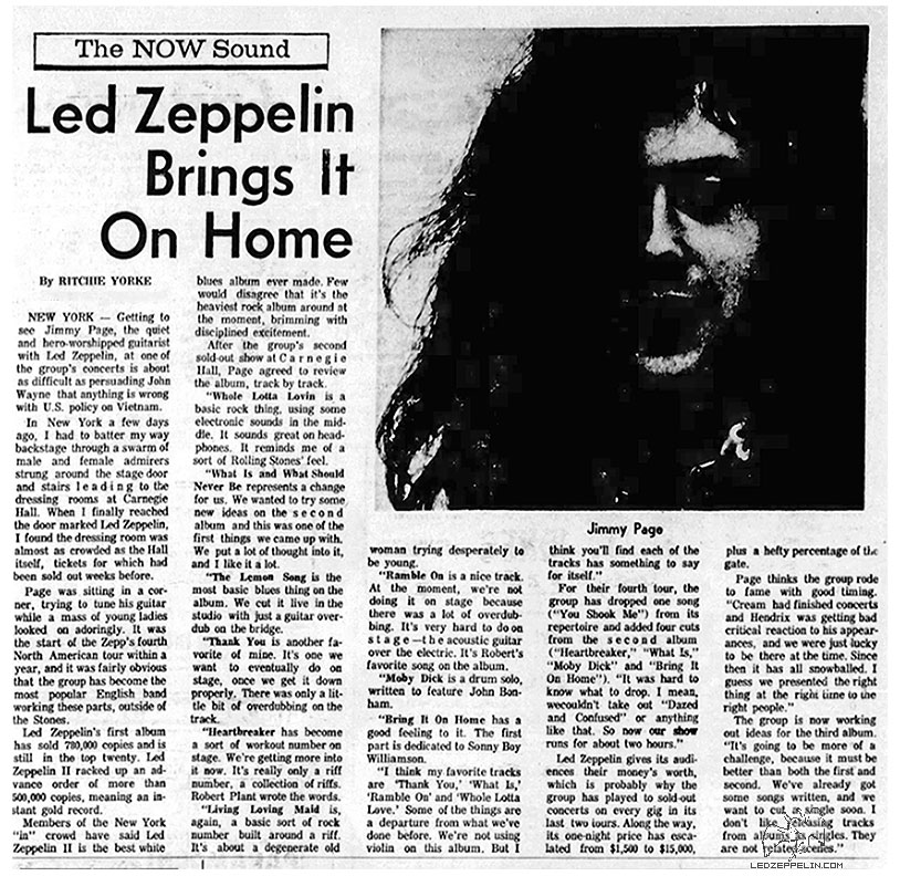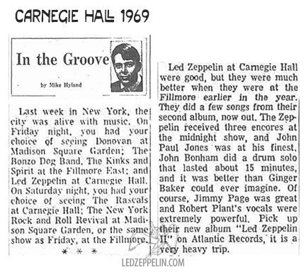 Review (I): Led Zeppelin became the first hard rock act to play Carnegie Hall since the Rolling Stones tore the place up some five years ago. Even up against Donovan at Madison Square Garden (a complete sellout), both of Zepppelin's shows went clean, with tickets being scalped as much as twice their original price! Though the management was uptight at half the audience dancing on top of their seats, and tried desparately to control the encores, the group managed to pull off one of the most exciting performances ever. They featured a selection of material from their new album, in addition to Jimmy Page's haunting "White Summer" solo and Bonzo's 25 minute attack on the skins. (J. Harris, Oct '69)