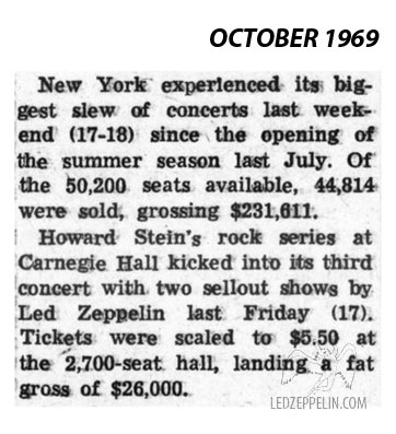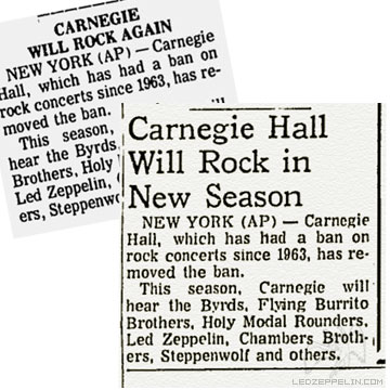 Review: Led Zeppelin became the first hard rock act to play Carnegie Hall since the Rolling Stones tore the place up some five years ago. Even up against Donovan at Madison Square Garden (a complete sellout), both of Zepppelin's shows went clean, with tickets being scalped as much as twice their original price!