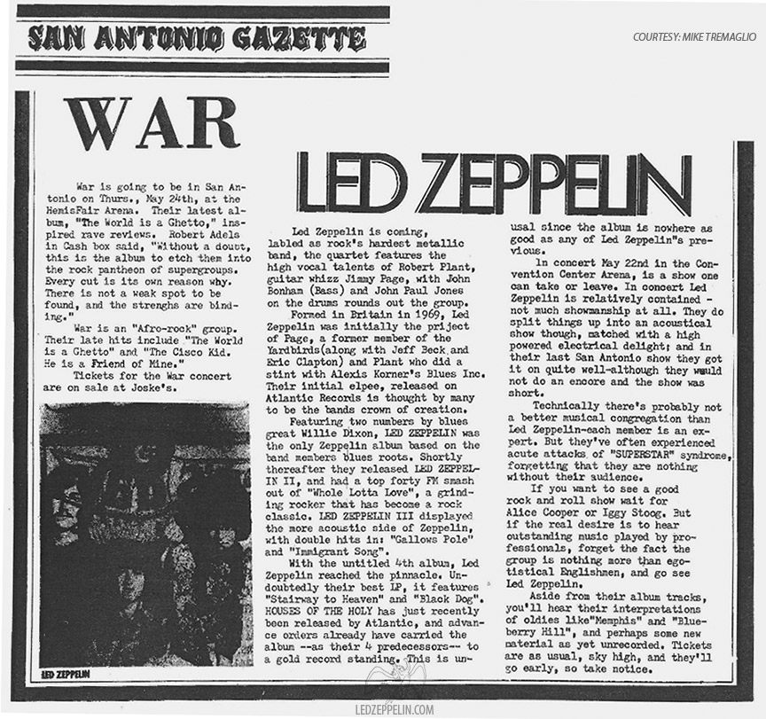 Setlists during this tour include: Rock and Roll, Celebration Day, (Bring It On Home intro) Black Dog, Over the Hills and Far Away, Misty Mountain Hop, Since I've Been Loving You, No Quarter, The Song Remains the Same, Rain Song, Dazed and Confused (incl. San Francisco), Stairway to Heaven, Moby Dick, Heartbreaker, Whole Lotta Love, The Ocean.