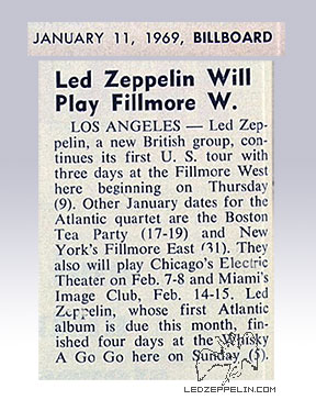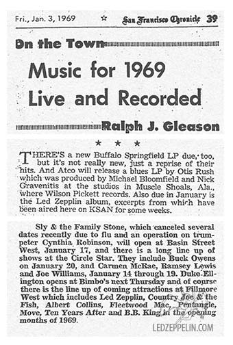 The Zeppelin sticks pretty close to the blues in their sets. Their “How Many More Times” starts with a lazy Jimmy Yancey-style beat (or Elvis Presley for a later generation) and works up to a block-busting climax; Dazed and Confused features a Plant vocal that’s like an extra powerful male Janis Joplin, if you can imagine. [SF Examiner / Jan. 11, 1969]
