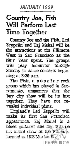 Hail and farewell this weekend at Fillmore West. Goodbye to Country Joe and his Fish, who swim their own ways after Sunday night and greetings to Led Zeppelin, as impressive a new British rock group as we’ve ever heard.