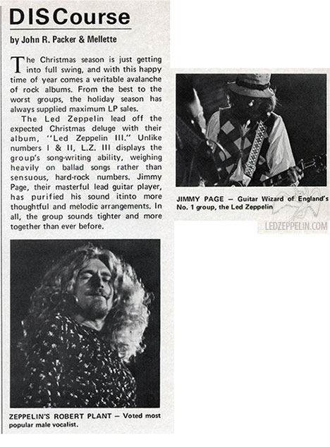 Finally, it must be mentioned that, apparently a trifle bored with being enormous fun, Zeppelin has taken to slipping quiet and definitely musical bits in between its dreaded screamers, bits like a pleasant (if far from dazzling) organ interlude by John Paul Jones. [J.Mendelsohn/LATimes/9-7-70]