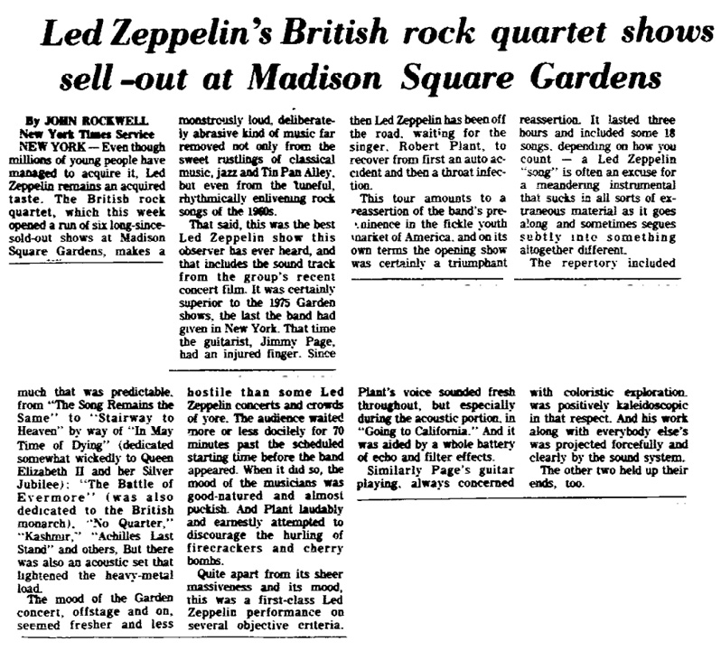 The Song Remains The Same, (The Rover intro) Sick Again, Nobody's Fault But Mine, In My Time of Dying, Since I've Been Loving You, No Quarter, Ten Years Gone, Battle of Evermore, Going to California, Black Country Woman, Bron-Y-Aur Stomp, White Summer ~ Black Mountainside, Kashmir, (Out On the Tiles intro) Moby Dick, Jimmy Page solo, Achilles Last Stand, Stairway to Heaven, Heartbreaker.