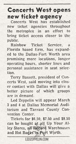 Press Review: Friends were "quite impressed" about the March 5 Led Zeppelin concert in Dallas. Zeppelin had a "fantastic light show and Jimmy Page stole the show with some fine guitar solos.