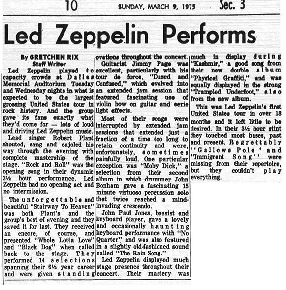 An excellent show for an appreciative Texas audience, and the first visit back to Dallas for Zeppelin since 1971. [1975-03-16-PNEWS - by J. Edminston]