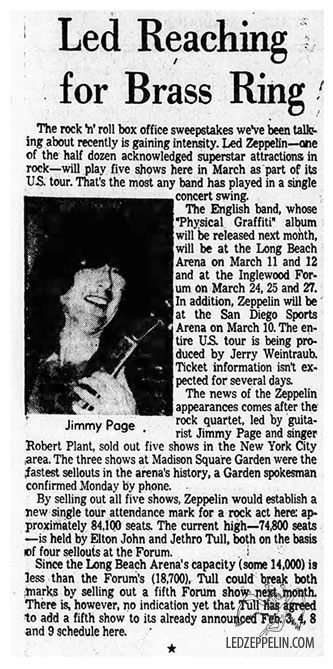 The group chose its repertoire from its entire history, from its beginnings to the new double Physical Graffiti album; musically the most gratifying moments came on No Quarter opening with Jones’ meandering piano solo during which the noise-loving crowd grew noticeably restless.