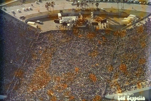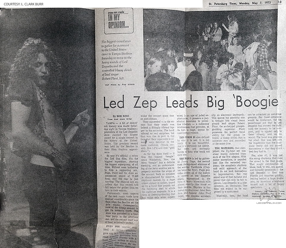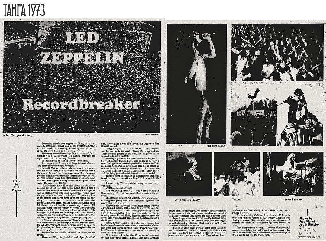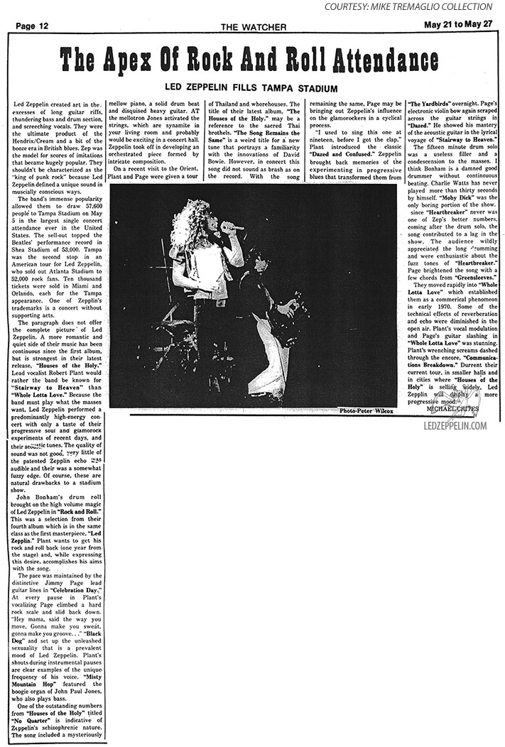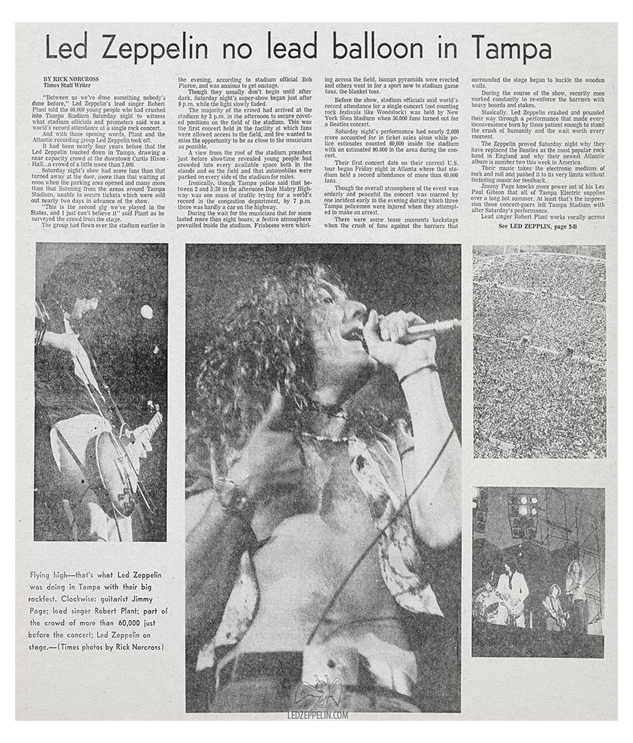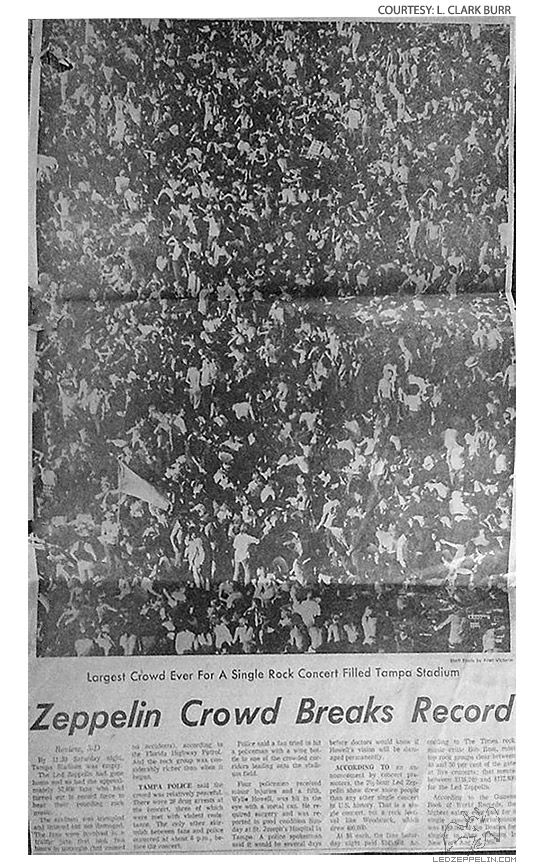 This was May 5 at the Tampa Stadium, the night after the British group started its U.S. tour in Atlanta. Attendance in Tampa was 56,800, with a $309,000 gross. Led Zeppelin is on a 33-concert, 30-city tour during May and July, with June off for vacation, expecting a total gross of $3 million. The quartet performs without an opening act or intermission, for two and a half hours.