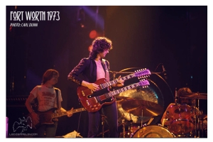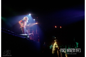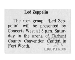 Zeppelin Record -- Led Zeppelin, well on their way to the most successful rock tour in history, showed once again that they are the most popular group since the Beatles. In Dallas May 18, Led Zeppelin drew 10,000 fans to Memorial Hall and then came back the very next night with a standing-room-only concert in Ft. Worth that drew 13,500. With back-to-back dates in the Dallas-Ft. Worth area, Led Zeppelin has set yet another record by selling out both arenas on successive nighs. (May 1973)