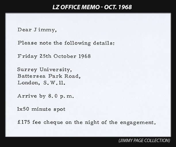 The band make their official debut as "Led Zeppelin". The show was hyped as "The First Big Dance of the Term" and some early printed material listed them as "The New Yardbirds". It was commonly (incorrectly) listed as taking place in Guildford, however this show occurred at the University of Surrey, Great Hall, Battersea Park Rd, London. An office memo from Jimmy Page's personal collection also confirmed this information: "Friday 25th October 1968. Surrey University, Battersea Park Road, London, S.W.11. Arrive by 8pm. 1x50 minute spot. £175 fee cheque on the night of the engagement."